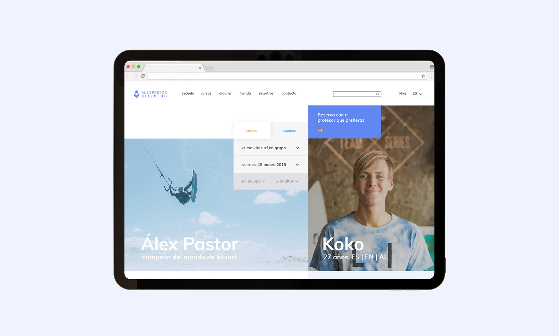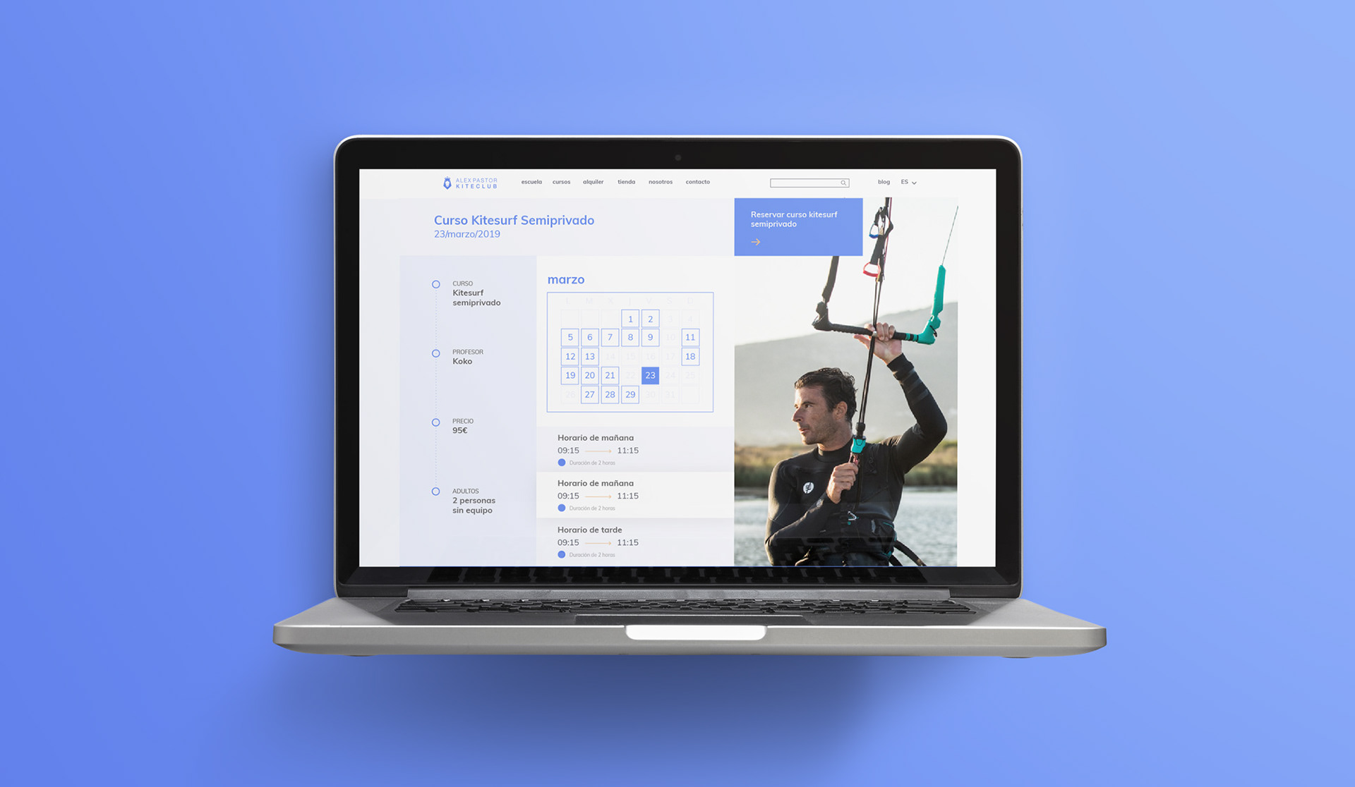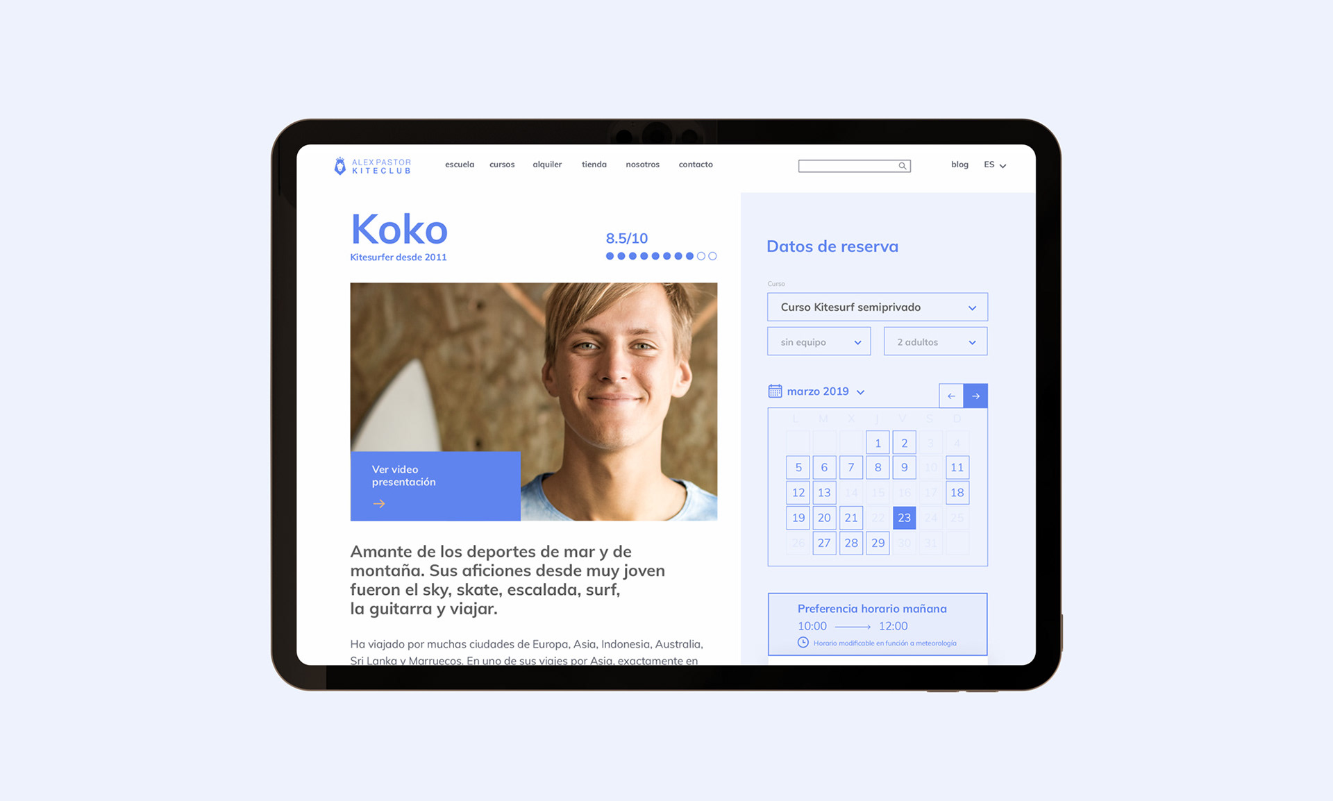 De este modo, se trabajó en una web que aglutinaba información corporativa, funcionalidades de e-commerce y herramienta de reserva de clases. Tras una investigación, conseguimos una herramienta potente que permitía, de forma muy flexible para el usuario, seleccionar entre diferentes variables: elegir entre los diferentes cursos, revisar los perfiles y seleccionar a su instructor favorito, incluir o no alquiler de material o consultar el calendario de reserva, en menos de un minuto en cualquier dispositivo.